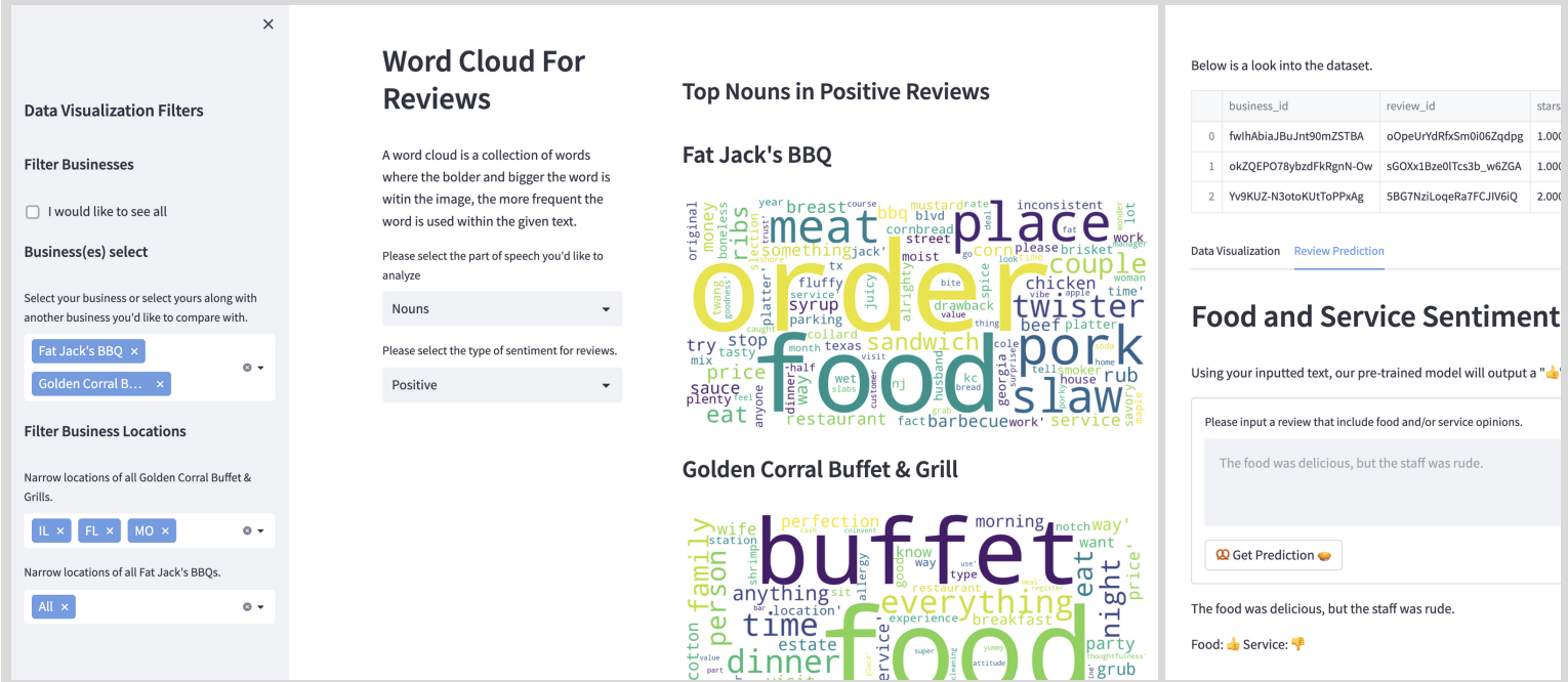 An aspect-based sentiment model that predicts food and service sentiments based on a given Yelp review. Included in the project is a Streamlit application that allows business users to see their review analytics and has a sentiment generator.